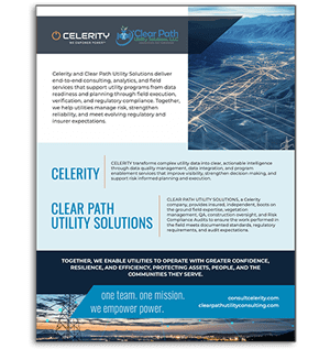 Celerity and Clear Path Utility Solutions deliver integrated consulting, analytics, and field services that support utility programs from data readiness and planning through field execution, verification, and regulatory compliance.